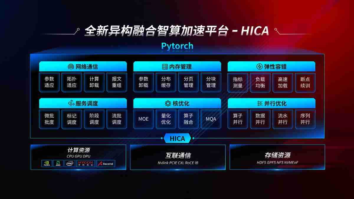 通过自研的服务层、、中间适配层、、、以及调度编排算法,,,,采用数据并行、、模型并行等多种并行方式,,,把并行计算任务进行有效的分解,,,,使其分别由相应的软件栈和算力资源来承接。。。。当GPU资源变化,,,HICA可以实时动态调度计算子任务并调整模型拓扑和架构,,,以充分聚合各种算力资源。。