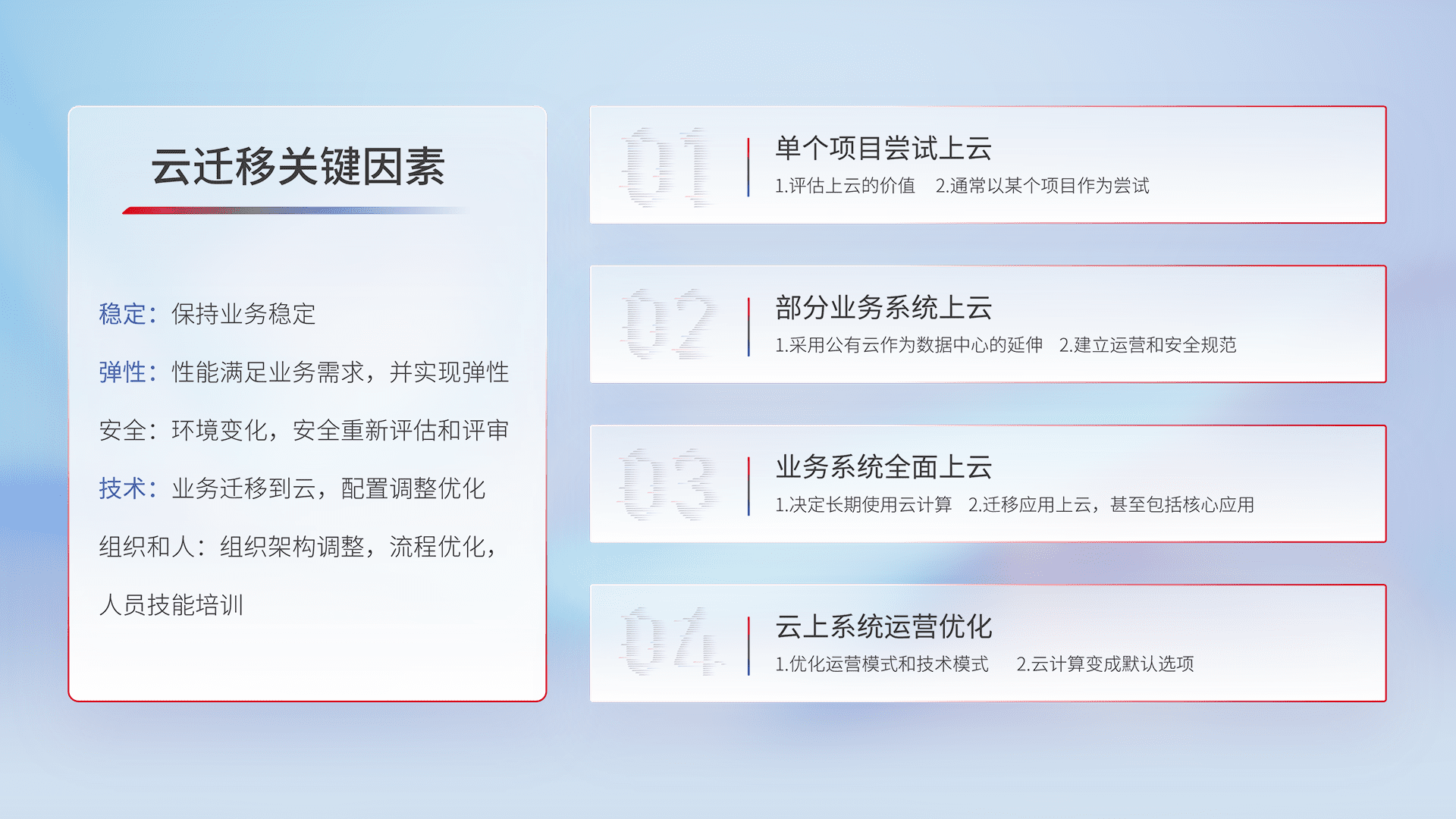 结合实际业务,,,,从规划设计、、云平台选型、、云原生改造、、、数据迁移、、、集成交付,,,,迁移全过程为客户识别最佳上云路径,,,做好风险识别管理,,,,设计网络架构、、、、身份权限、、、安全审计合规、、、操作审计、、日志审计、、、、监控告警策略、、、多站点容灾设计等,,,对云上基础设施进行整体规划,,,,提升IT治理水平,,以满足弹性、、、、高可用、、、、高性能的需求。。。
