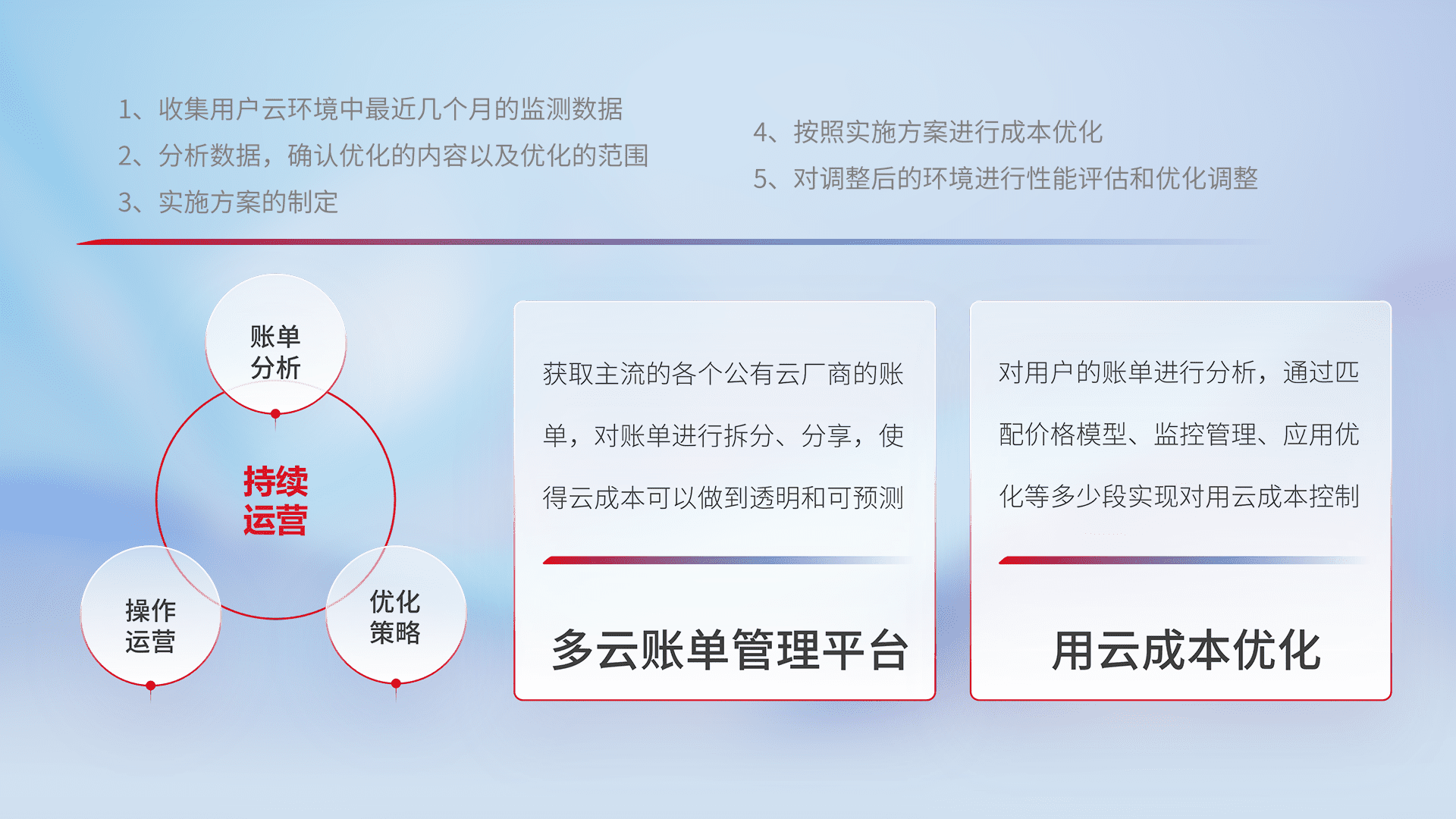 通过多云纳管,,以统一的资源数据模型把客户的云资源进行抽象和封装,,进而实现对多云资源的统一操作,,保障云资源管理的可靠性、、、稳定性与可用性。。量身定制化运维内容,,,,配置、、开发运维、、、、补丁管理、、、、备份、、、监控、、、认证和访问管理、、、、审计和日常巡检等,,,,保障在用云过程中的可靠度,,,,稳定度以及高可用率。。