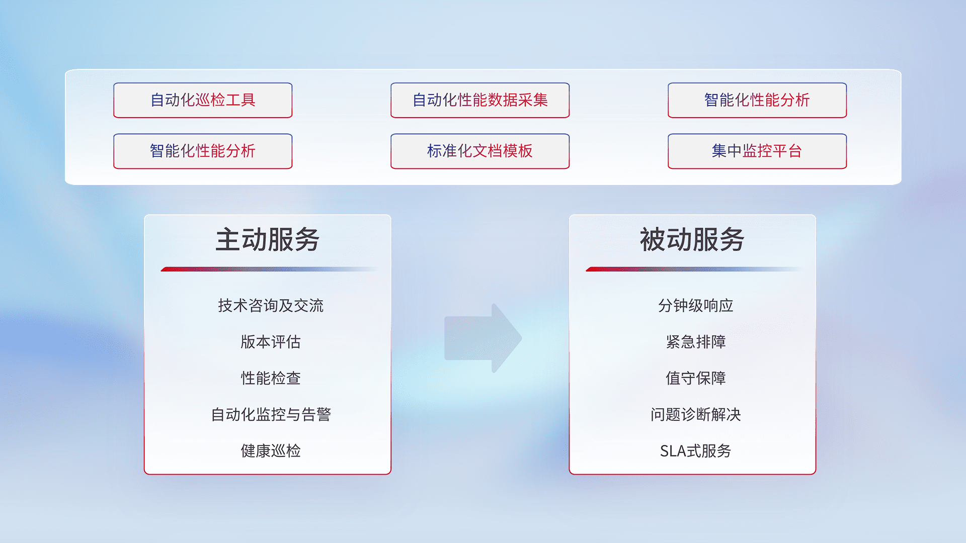 智能化工具和标准化文档,,,保障服务质量,,提供主动服务(包含技术咨询、、版本评估、、、性能检查、、自动化监控与告警、、、、健康巡检)和被动服务包含(分钟级响应、、、紧急排障、、、值守保障、、、、问题诊断解决、、、SLA服务)。。。